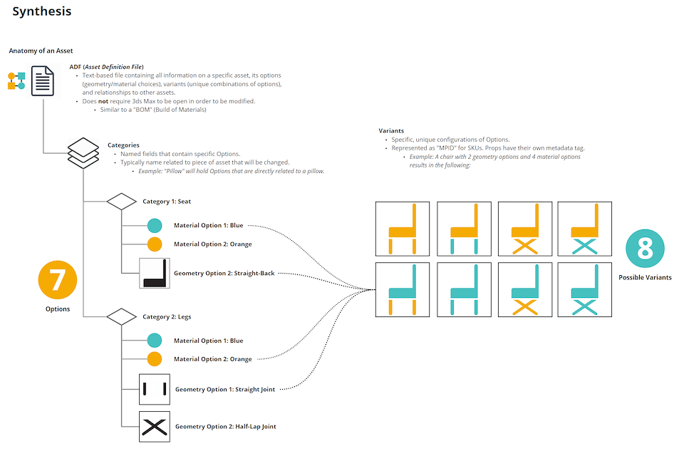 Synthesizing initial notes into simple graphic showing off the concept of an Asset Definition File (ADF) and the creation of Product Variants.