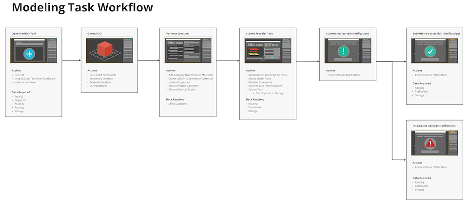 Low-fi wireframes/workflow of 3D modeling portion of Task Platform.